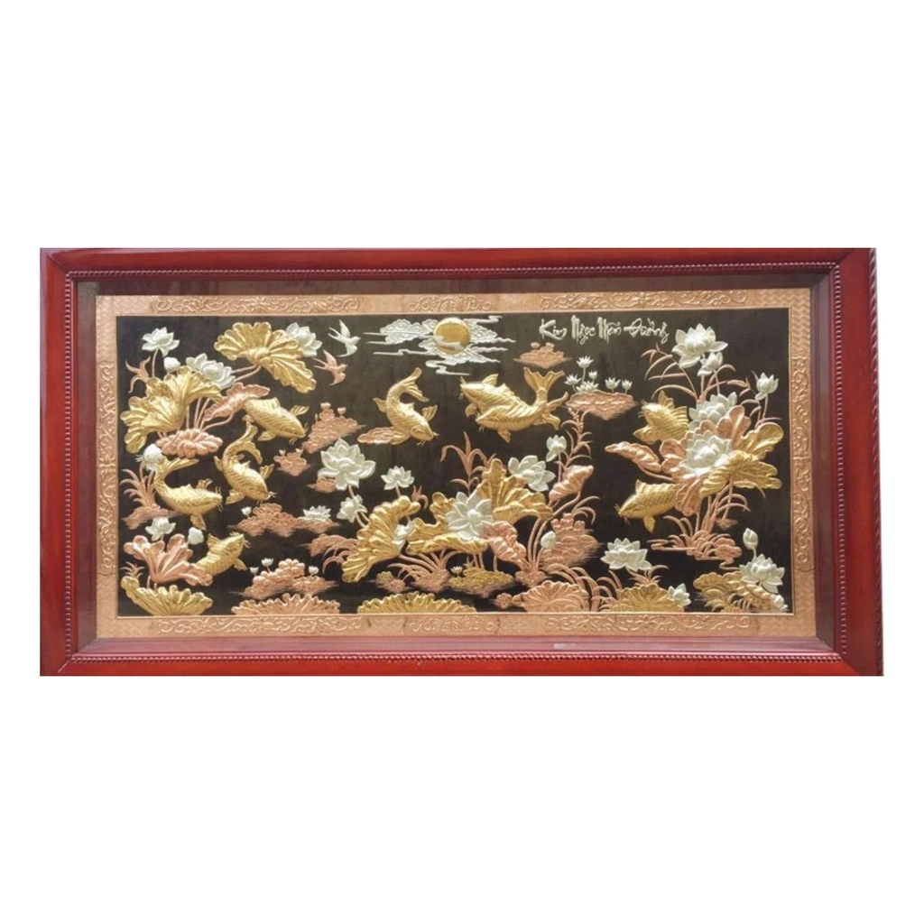 🎨 Thiết kế tinh xảo: Hình ảnh cá chép uốn lượn quanh những bông sen nở rộ, được thể hiện mềm mại với màu sắc hài hòa, bố cục cân đối – mang lại cảm giác thư thái và tinh tế cho không gian.