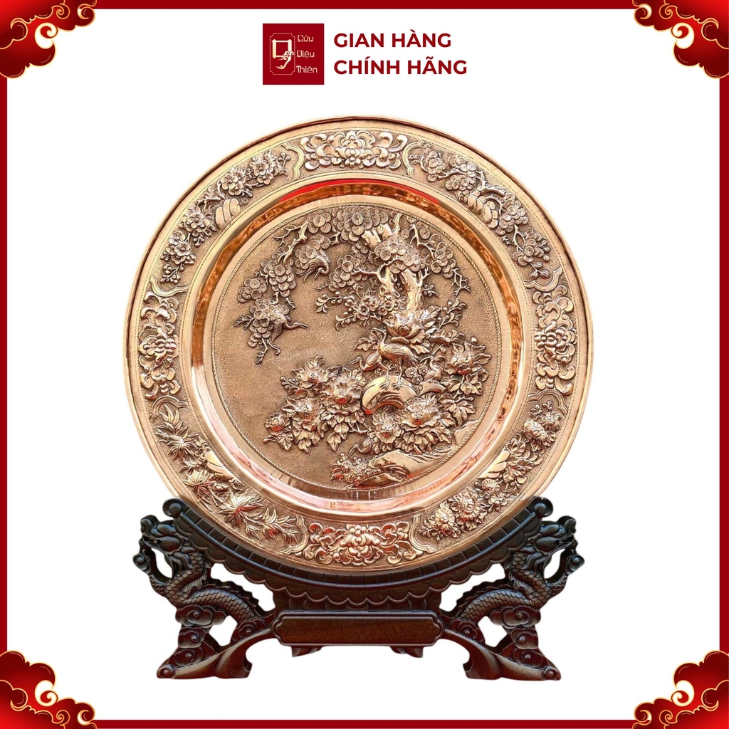 🎨 Thiết kế tinh tế: Đĩa đồng chạm khắc hình ảnh cây tùng vững chãi, đôi hạc thanh tao, kết hợp hoa văn mềm mại, tạo nên vẻ đẹp sang trọng và đầy ý nghĩa.