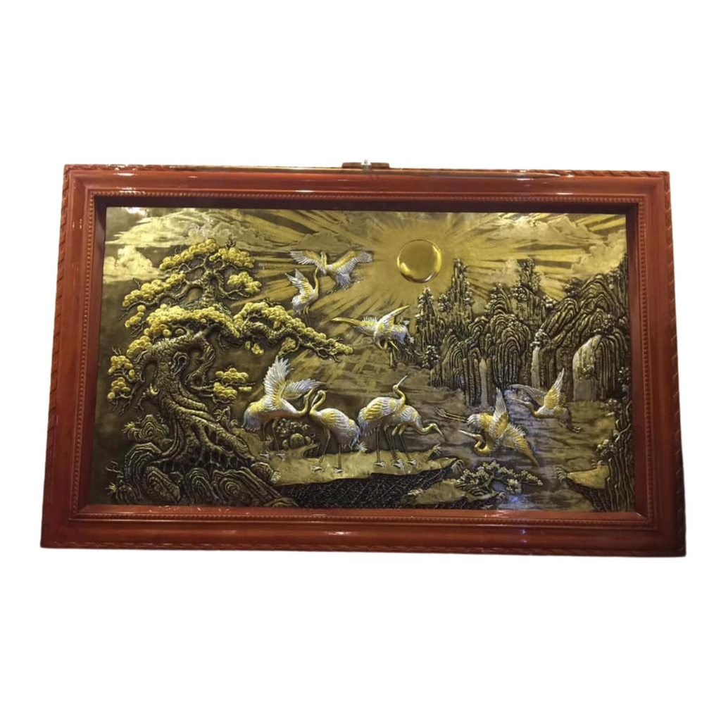 🦅 Chạm khắc tinh xảo: Tranh khắc họa hình ảnh cây tùng vươn cao mạnh mẽ và hạc bay lượn, là biểu tượng của sự trường thọ, sức khỏe và may mắn. Những đường nét chạm khắc chi tiết tỉ mỉ mang lại vẻ đẹp sống động.